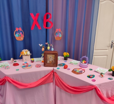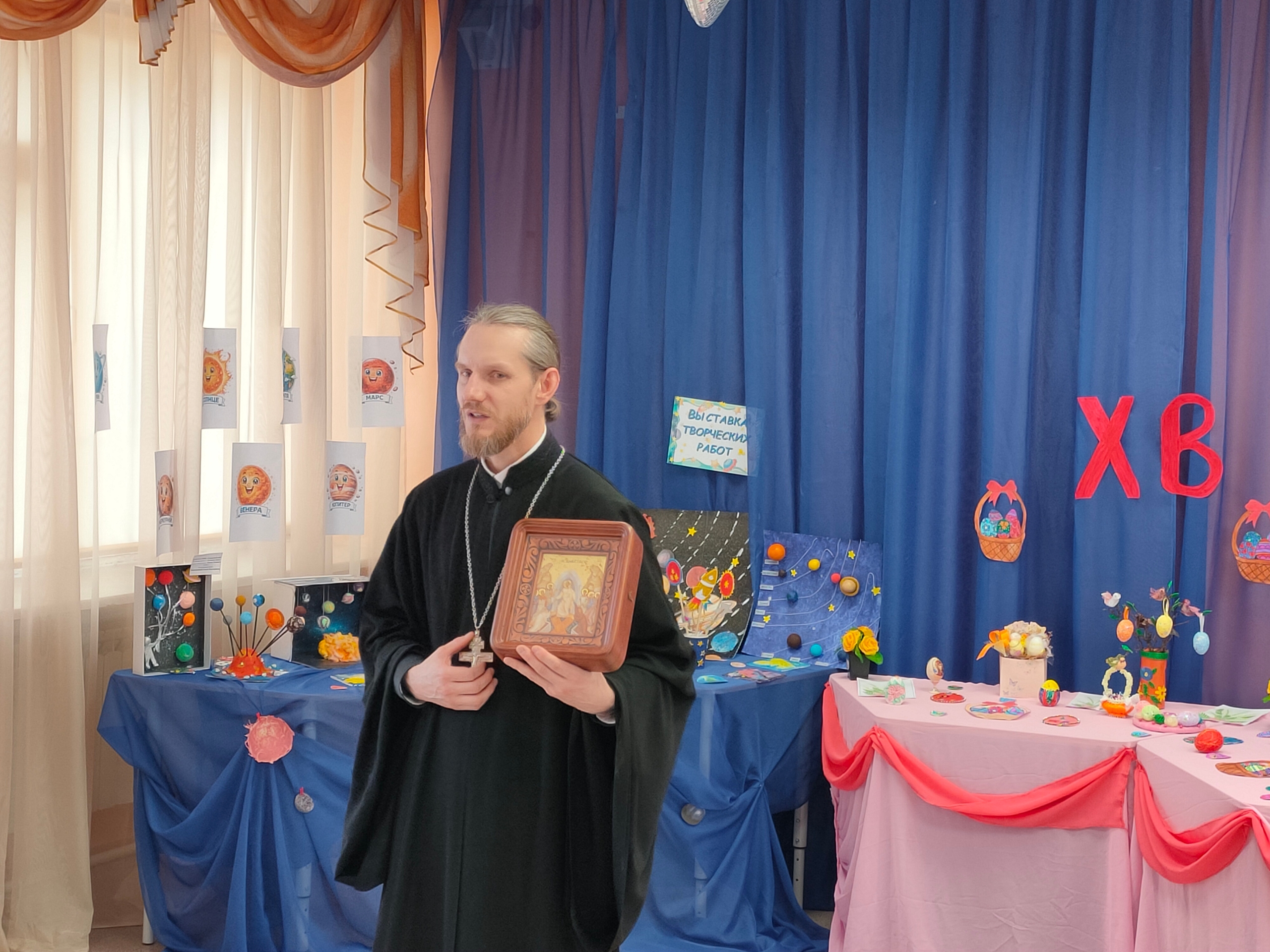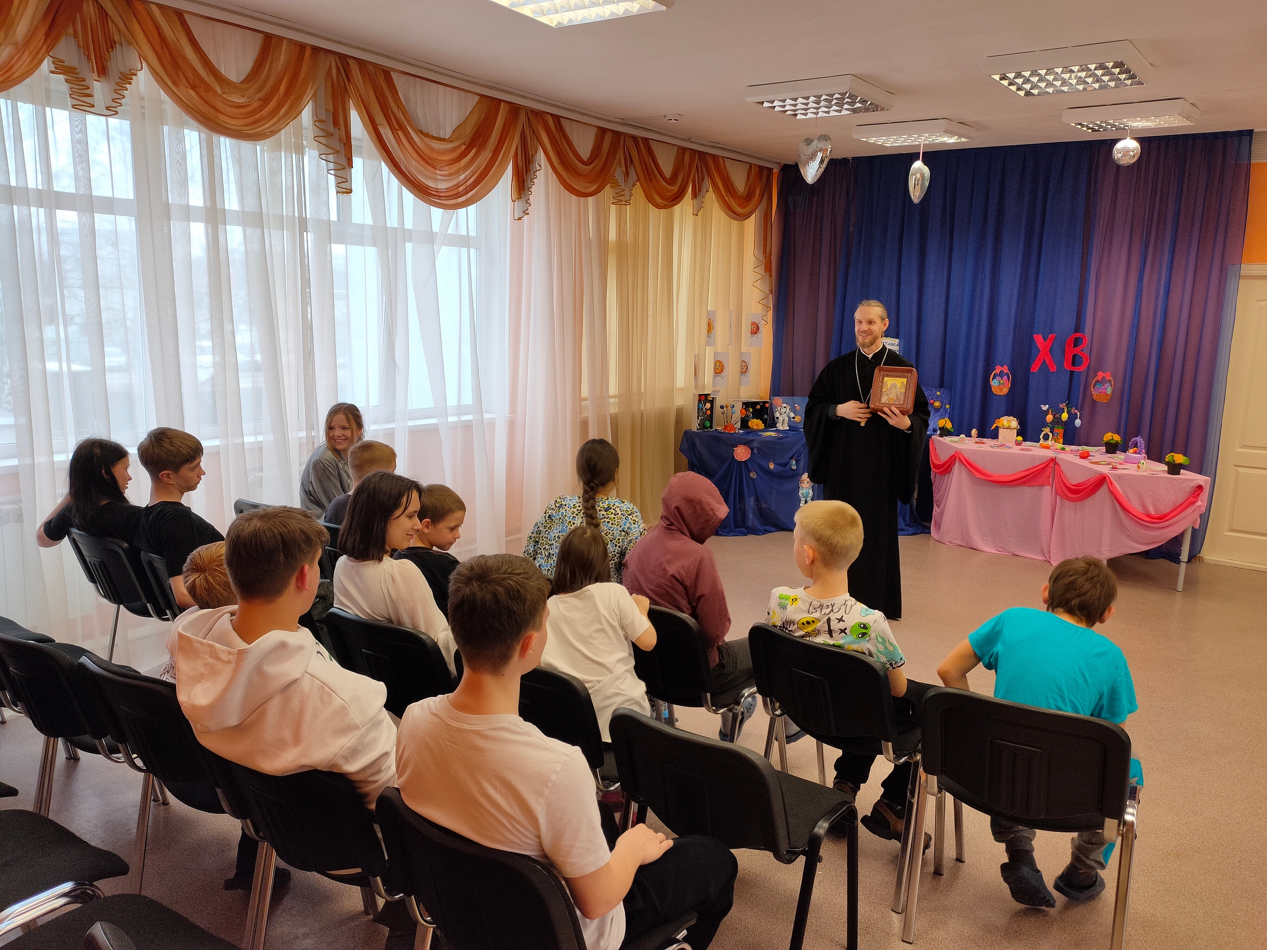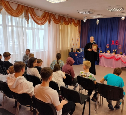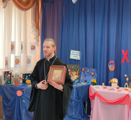 Клирик Благовещенского храма иерей Алексий Паплевка поздравил ребят с Пасхой, рассказал об истории этого праздника и о том, что символизируют традиционные пасхальные угощения — куличи и крашеные яйца.