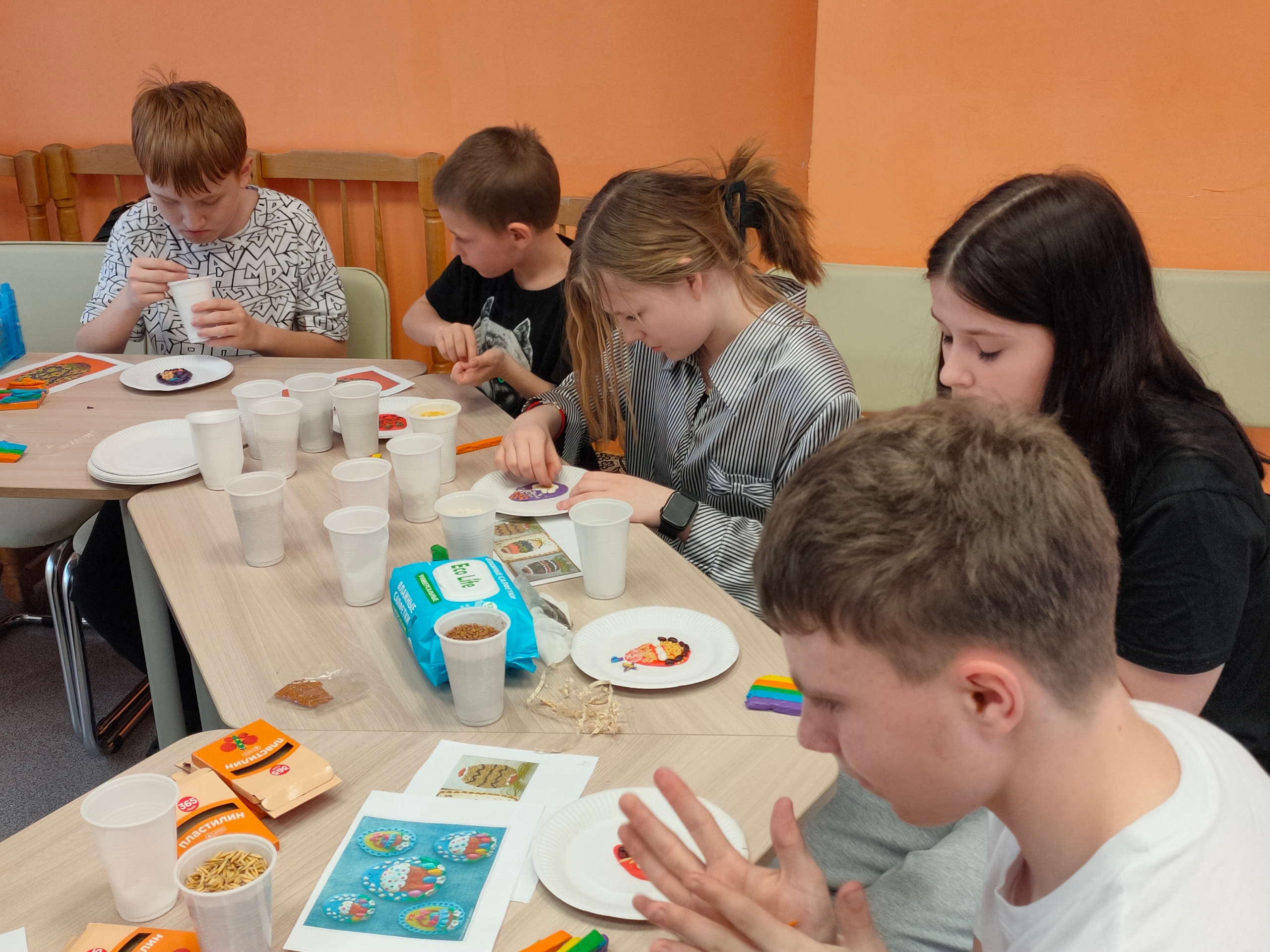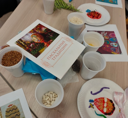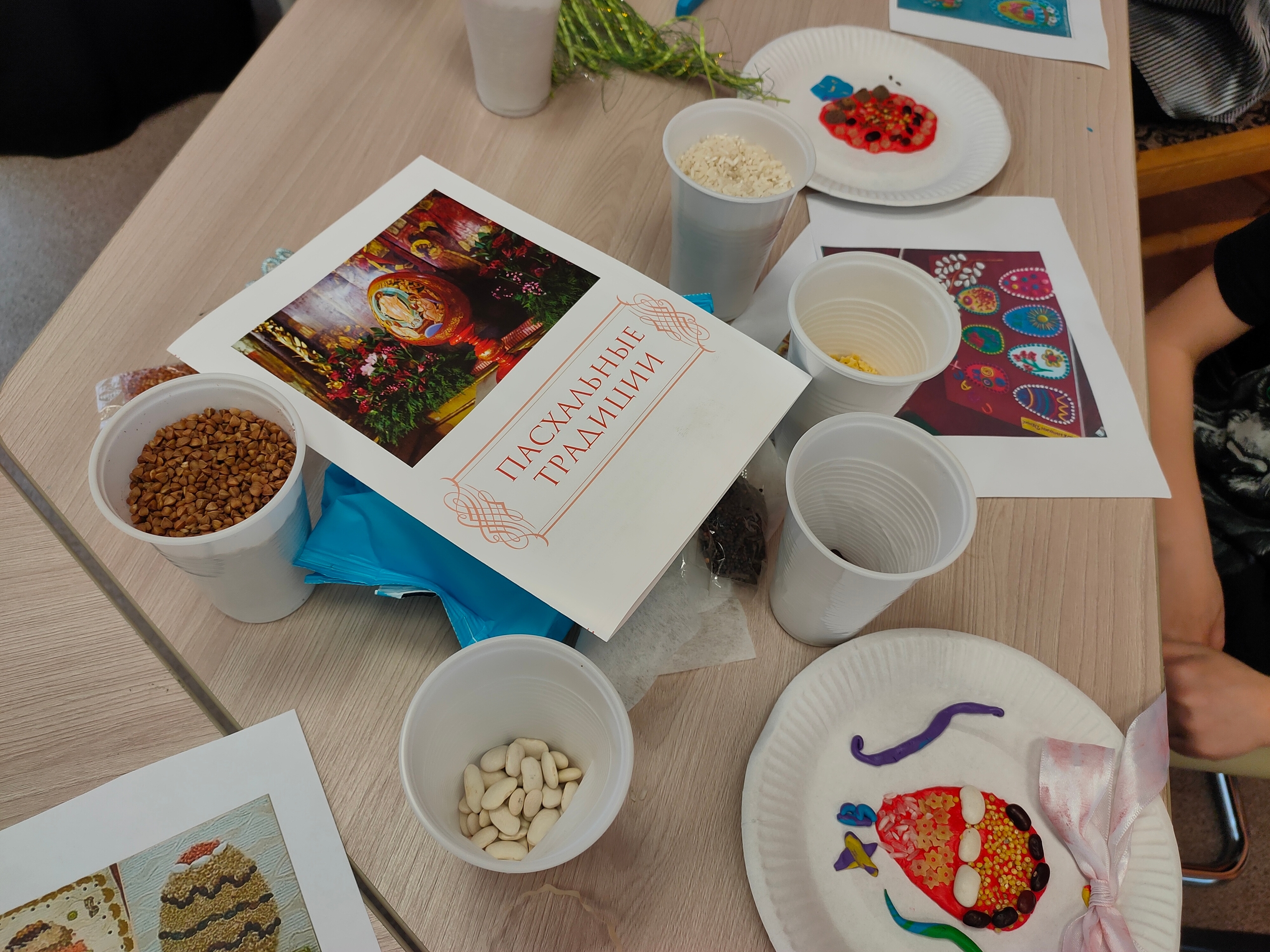 Матушка Юлия Паплевка провела для детей мастер-класс по изготовлению пасхальных поделок с использованием различных круп и пластилина.